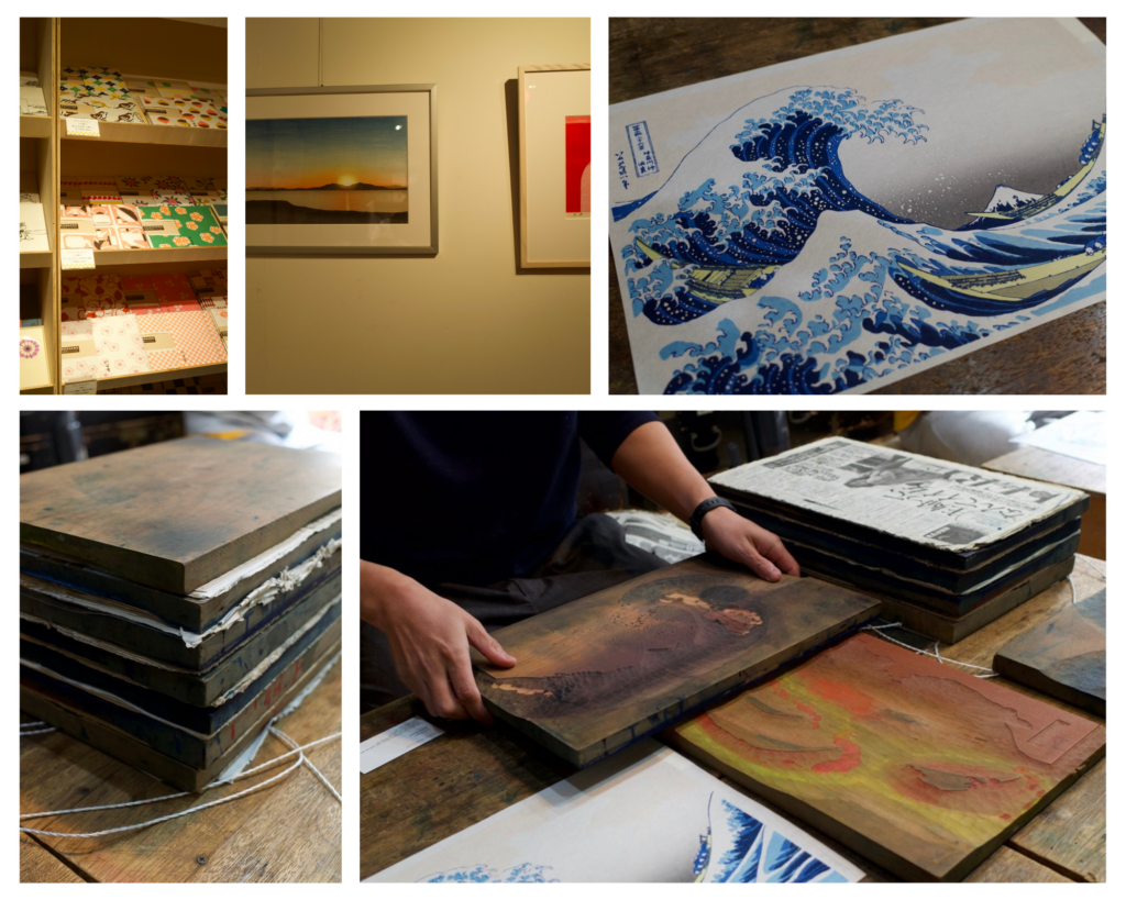 La fondation de cet atelier remonte à plus de 100 ans, en 1891. L’imprimeur M. Takenaka est à la 5e génération de l’atelier, il cherche constamment à innover tout en restant fidèle aux techniques traditionnelles. Il collabore notamment avec de jeunes artistes et s’engage aussi dans des démarches plus historiques, comme l’impression à partir de planches de bois anciennes.